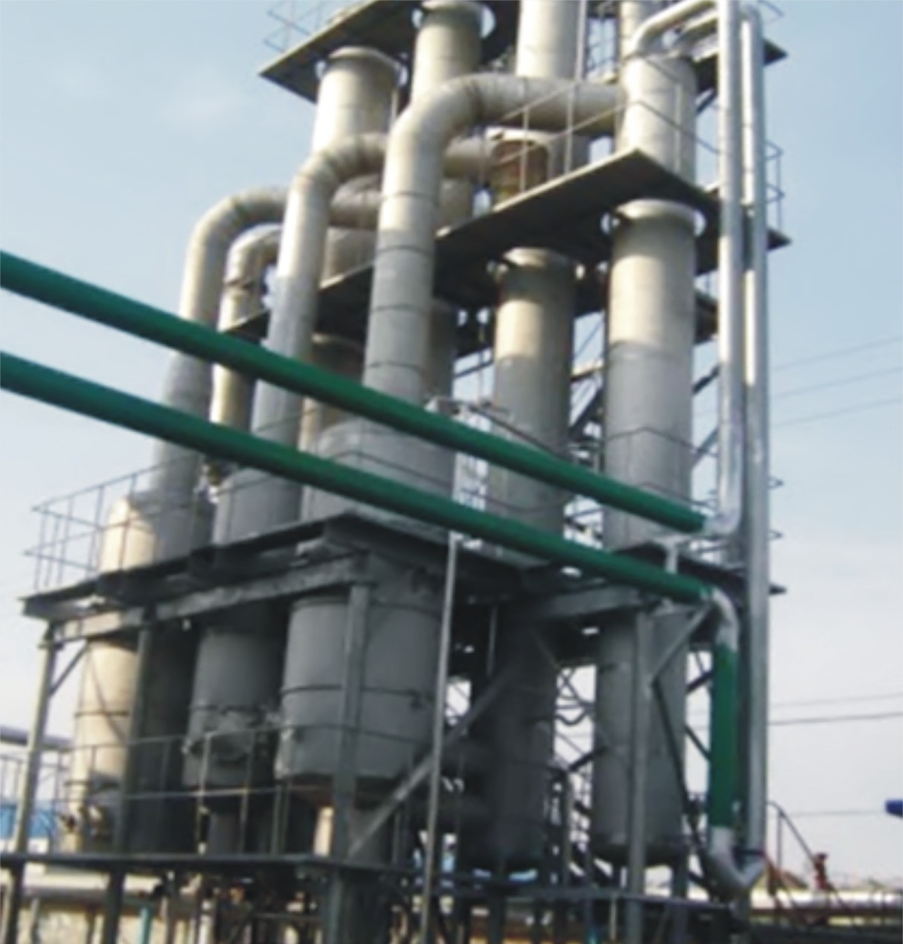 料液由加熱室頂部加入,經(jīng)液體分布器分布后,在重力和真空誘導(dǎo)及氣流作用下呈膜狀向下流動,在管內(nèi)被加熱汽化,被汽化的蒸汽與液體一起由加熱管下端引出,經(jīng)汽液分離后即得到濃縮液,料液蒸發(fā)出的二次蒸汽進入下一效蒸發(fā)器加熱或進入冷凝器。
